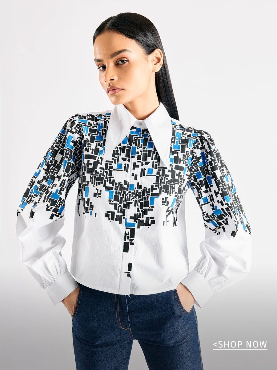 Upgrade your wardrobe with our Fashionable Key Code Printed Crop Shirt. Its boho-inspired boxy fit and full sleeves with cuffs create a balanced silhouette, perfect for both casual and semi-formal occasions. The broad collar exudes sophistication, while the front opening with buttons adds a touch of flair. Crafted from premium cotton, these printed shirts for women offers a comfortable and breathable fit. The intricate print showcases your unique taste in fashion, making it a versatile addition to your wardrobe. Embrace a look that seamlessly blends comfort and trendiness with our Printed Crop Shirt.